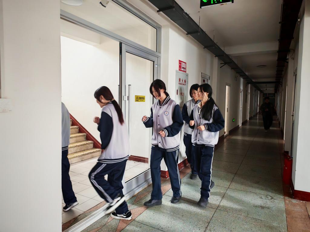 应急疏散演练模拟学生宿舍楼夜间突发“火情”,学生迅速按照预定的路线疏散,紧张有序地撤离至操场安全区域。整个过程衔接顺畅,未发生拥挤、踩踏等情况,达到了预期效果。